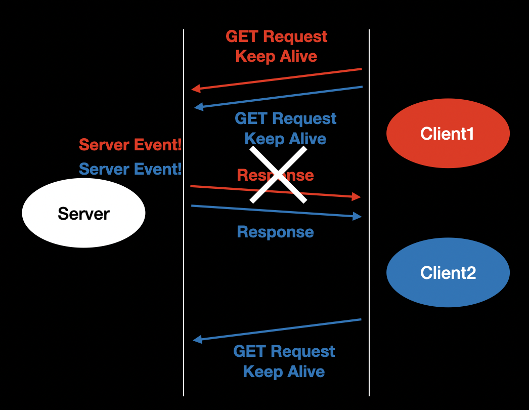 또한 서버의 구현에 따라 클라이언트 인스턴스가 메시지 수신을 전혀 하지 못하는 경우가 있습니다. Server event 가 발생하여 응답을 보냈으나 네트워크, 브라우저의 문제 등의 경우로 누락된 경우 Client 가 정상적으로 응답받은 것을 확인하지 못하게 될 것입니다. Client 역시 응답이 중간에 누락된 것을 확인하지 못하고 더 이상 server 와의 통신이 이루어질 수 없을 것입니다.