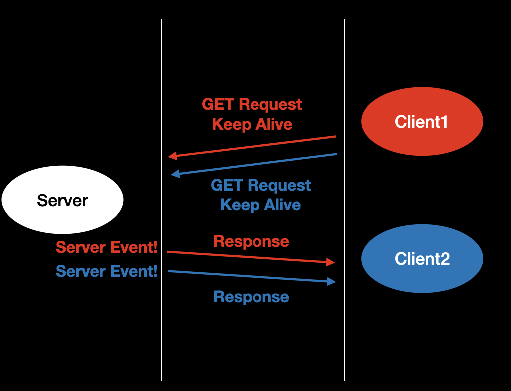 - Server의 Event 가 발생 시 Client의 GET request에 대해서 응답을 보내게 됩니다.